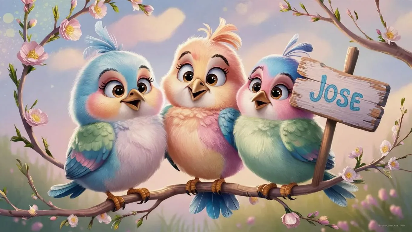 Create a vibrant Pixar-style AI-generated image of three curious furry birds with pastel blue, peach, and green feathers perched on a spring branch. Featuring 8k resolution, playful wildlife charm, floral details, and a whimsical "Jose" sign. Perfect for capturing renewal season magic with VivaGo.ai's advanced AI art tools.