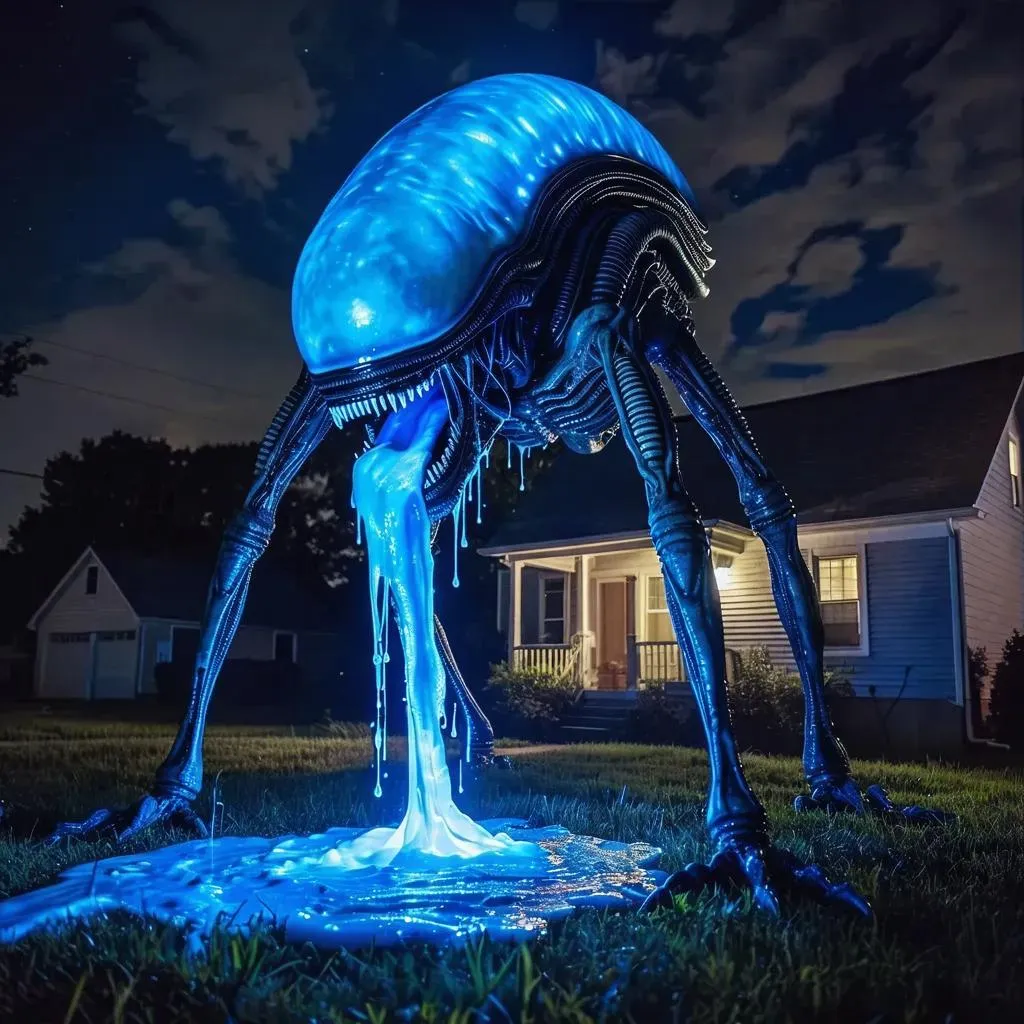 Vivid AI-generated scene of a colossal bioluminescent alien towering on spindly legs, spewing electric-blue slime onto a suburban house. Glowing grass and pulsating slime cast eerie shadows in this surreal night spectacle. Crafted with precision using Vivago.ai's AI image tools for hyper-detailed, otherworldly visuals. Perfect for sci-fi art, concept designs, or supernatural storytelling. Professional-grade effects merge alien essence with earthly chaos.