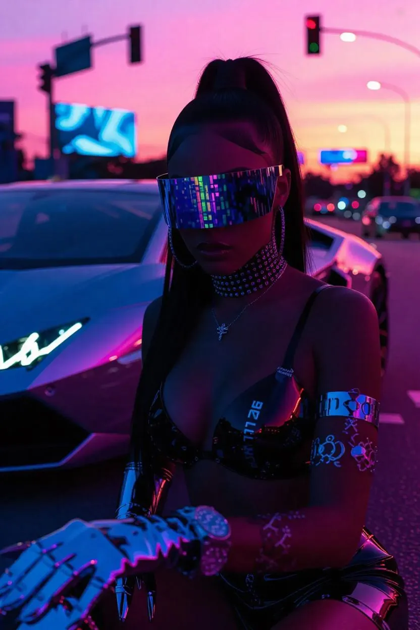 The cybernetic socialite's chrome-tipped Louboutins press against the Lamborghini Terzo's plasma accelerator, holographic highway barriers dissolving into prismatic dust. Neon sunset gradients fracture across her Balmain visor, revealing irises mirroring bioluminescent algae blooms. Graphene-fiber chassis hums with stolen crypto-energy, turbine rims vaporizing asphalt into AI-generated NFTs swirling into her wind-whipped hair. Self-illuminating highway splits into fractal patterns, AR billboards glitch into personal achievement montages. 2:3 composition thrums with velocity, Breitling smartwatch projects laser grid countdown, diamond-hardened microphones capture crystallized laughter, facets reflecting hyperdetailed cityscapes from parallel cyberpunk dimensions.