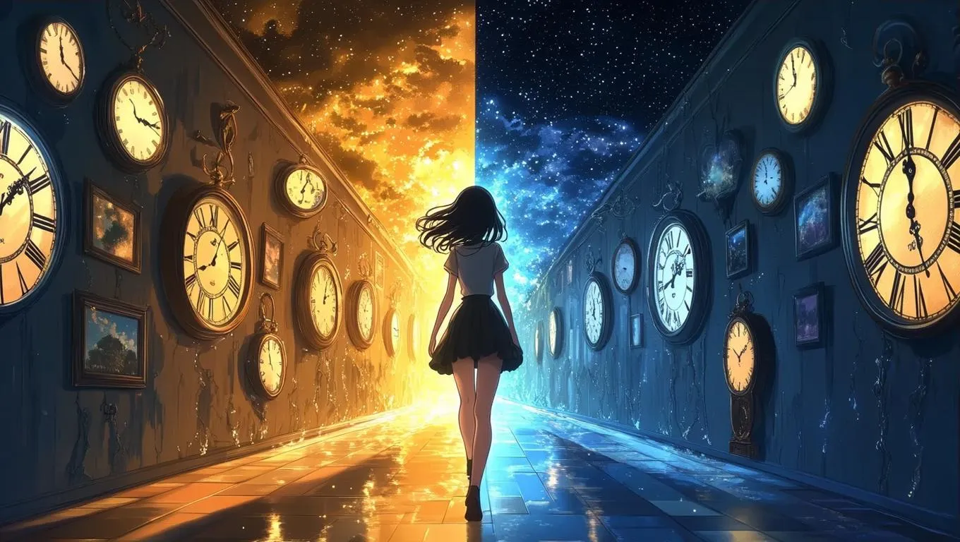 Transform text into surreal anime scenes with Vivago.ai's AI image generator. Craft cinematic visuals of a girl traversing a day-night hallway, walls lined with erratic clocks, her hair shifting hues. Achieve watercolor gradients, mirrored shadows, and precise surreal detail—ideal for creating liminal, otherworldly moments through AI-powered artistry.