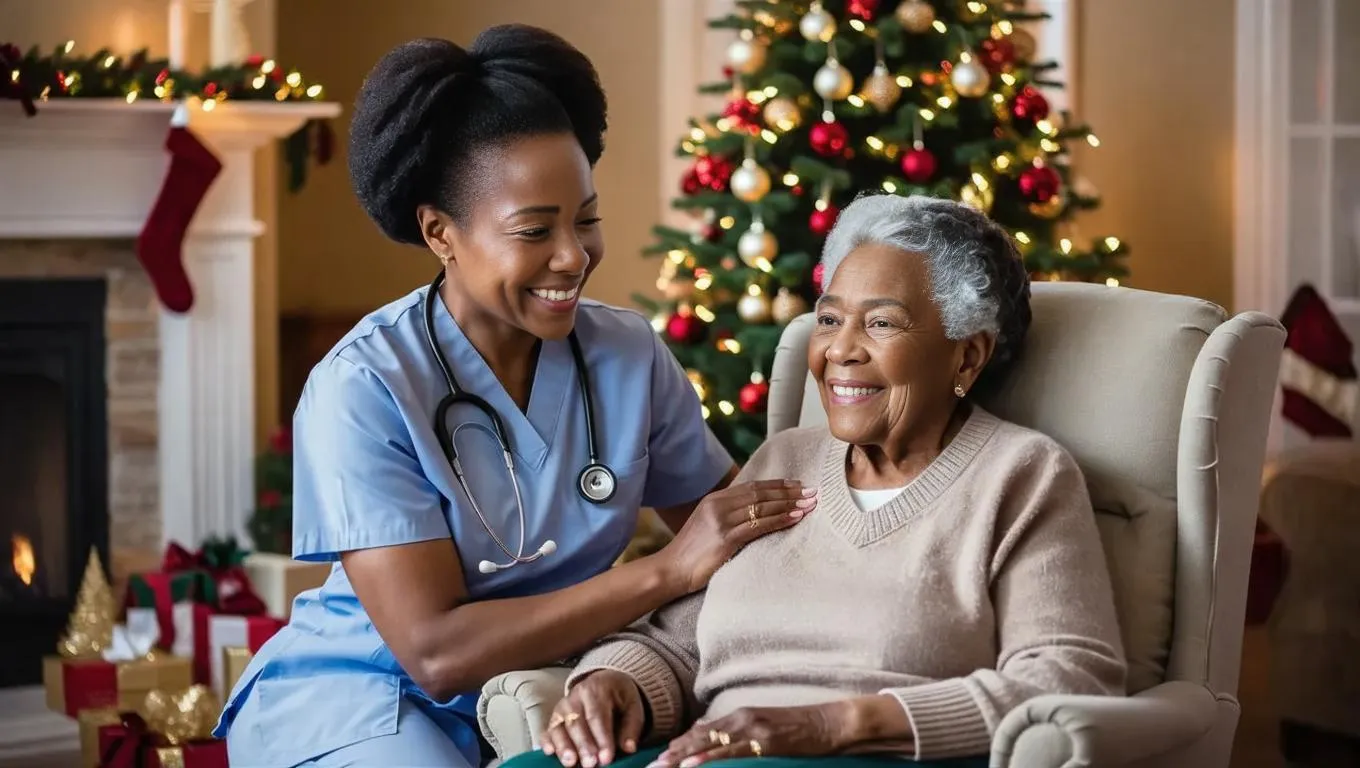 Generate a heartwarming AI image of a smiling African American nurse providing compassionate elderly care at home, featuring a festive Christmas tree backdrop. Perfect for healthcare promotions or holiday-themed content with vivid AI-generated visuals and professional editing tools.