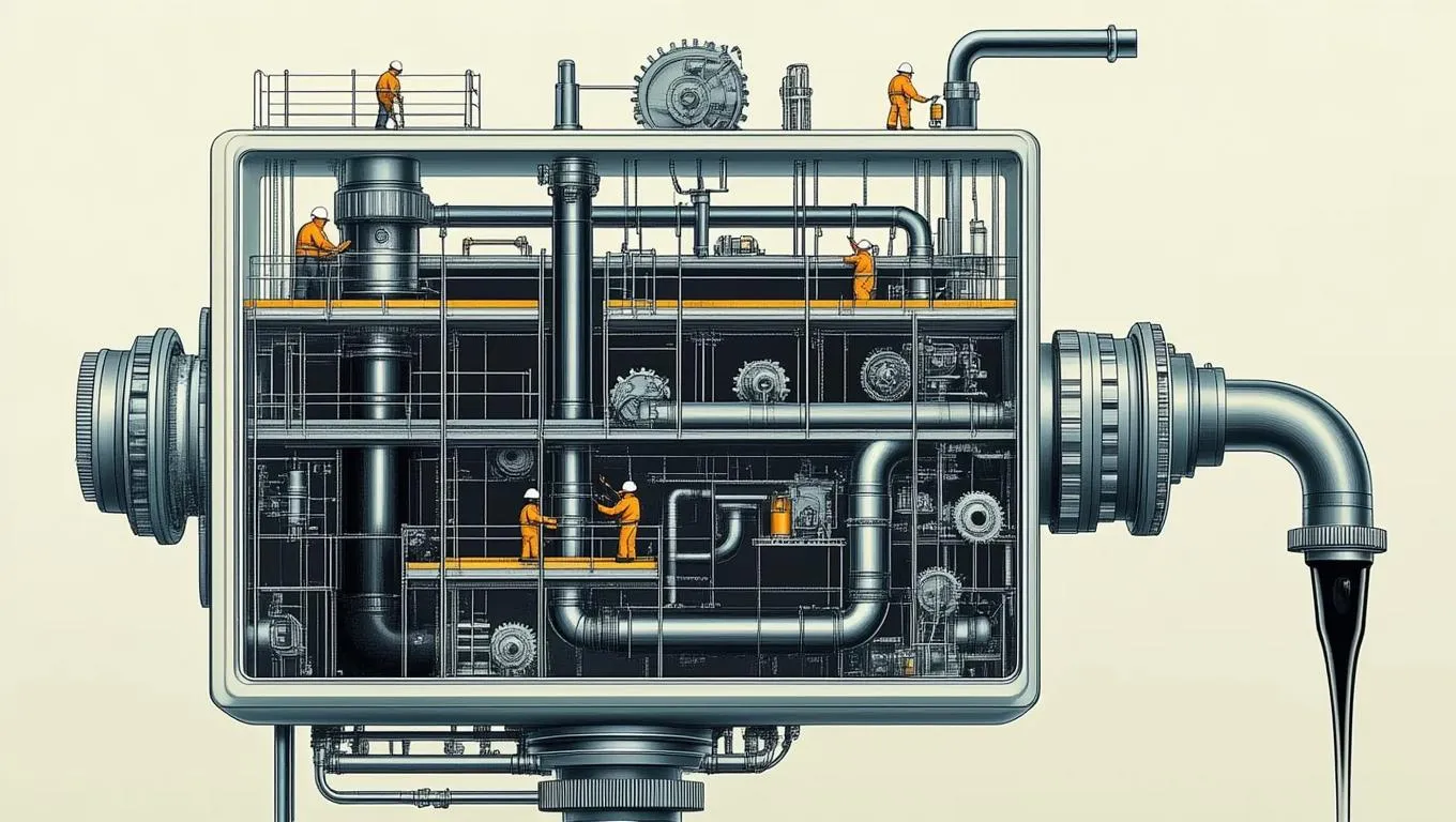Generate a sinister, intricate AI blueprint of a hand soap dispenser's mechanical pipeline system. Features 1:64 scale workers, gears, valves, pumps, and eerie liquid flow for industrial design visuals. Create precise technical illustrations with professional AI editing tools and dark aesthetic effects.