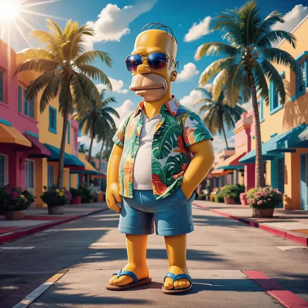 AI-generated Homer Simpson enjoying sunny Miami in vibrant tropical attire, styled with sunglasses and flip-flops. Macro-realistic 8K visuals capture palm trees, art-deco buildings, and carefree vacation vibes under clear blue skies. Perfect for vibrant, high-resolution creative projects blending humor and Miami’s iconic aesthetic. #HomerSimpson #Miami #SunnyWeather #Vacation