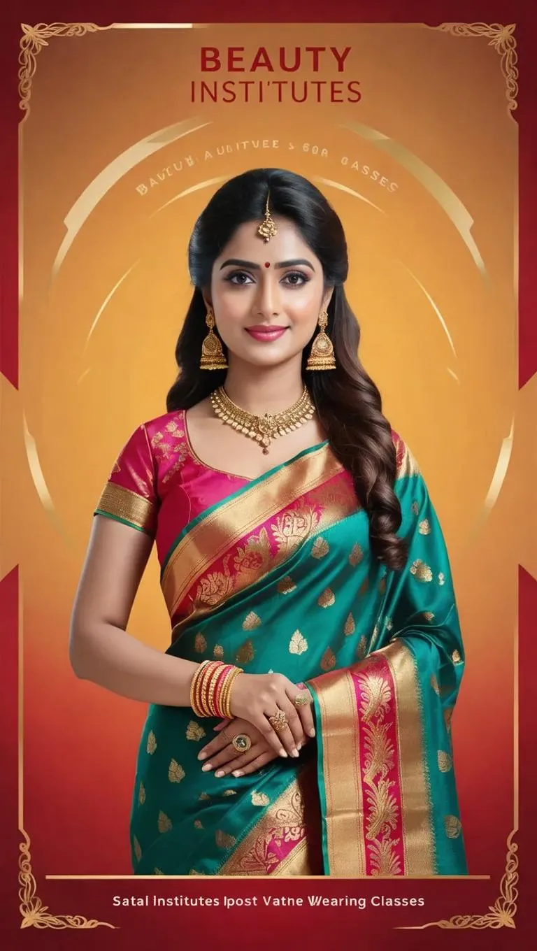 Create AI-generated posters for beauty institute saree wearing classes with vibrant visuals and traditional draping techniques. Showcase cultural elegance, expert tutorials, and professional styling tips using cutting-edge AI design tools to attract students to master saree styling effortlessly.