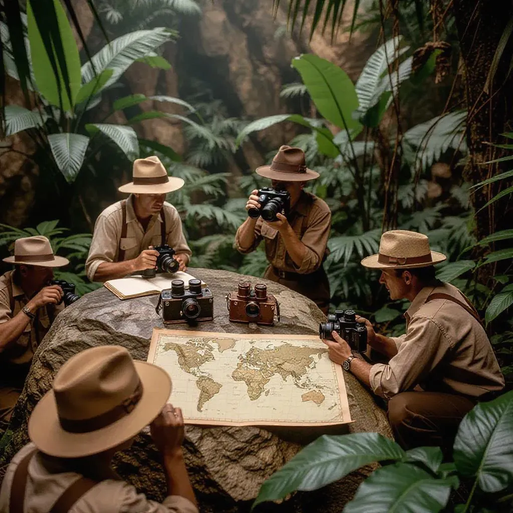 Unearth ancient alien hieroglyphs etched on jungle rocks with archaeologists in awe. Vivago.ai crafts retro 1950s collage-style visuals using vivid palettes, merging AI image generation with vintage aesthetics. Transform prompts into surreal scenes of cryptic discoveries, blending sci-fi mystery and nostalgic design for professional-grade creative projects. Explore AI effects for retrofuturistic storytelling.