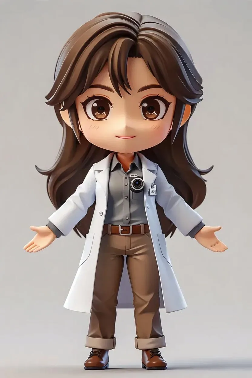 Create vibrant AI-generated 3D anime chibi art of Rintarō Okabe as a kawaii scientist girl. Featuring long hair, brown pants, gray blouse, lab coat, and spy camera accessory. Professional character design with vivid colors, high-detail rendering, and an inviting full-body pose. Perfect for anime fans and creative projects.