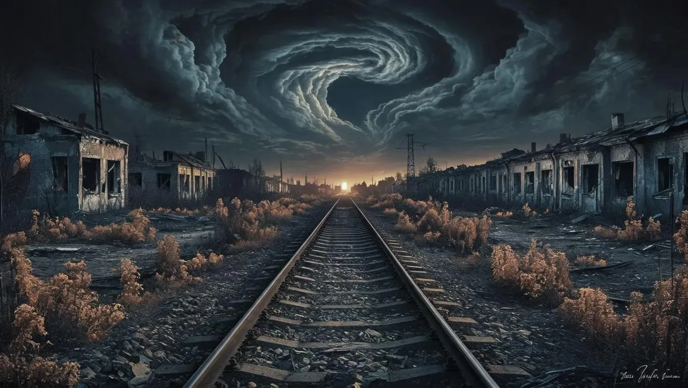 Generate a haunting AI image of Pripyat's abandoned railway at night. Crumbling buildings, overgrown tracks, and a spectral train under an overcast sky evoke eerie mystery. Vivago.ai crafts professional-grade visuals with AI effects, blending decay, eerie lighting, and ghostly atmospheres for spine-chilling, danger-laden scenes.