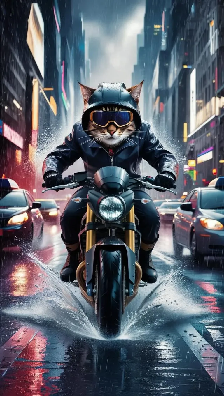 Create daring AI visuals with vivago.ai's advanced image generator. Transform text prompts into dynamic scenes like a raincoat-clad feline rider with sport goggles, racing through city streets. Explore customizable motor sport effects for vibrant, professional-grade AI art. Unleash creativity with AI-powered tools for eye-catching, high-quality image and video generation.