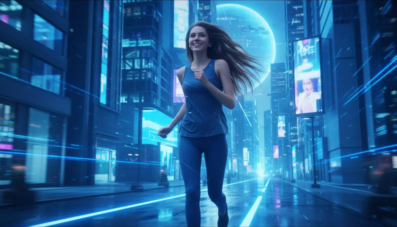 Generate a slim girl with long hair running happily in a vibrant blue-lit futuristic cityscape using VivaGo AI image generator. Create dynamic motion effects with professional AI editing tools for stunning visual content.