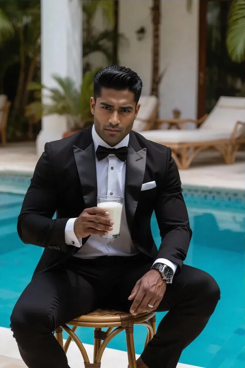 Transform your vision into reality with AI-generated visuals of a muscular Sri Lankan male model in a sleek black tuxedo and shorts. Experience dynamic spill effects as milk cascades over his physique, set against a luxury poolside backdrop with a leather stool. Elevate creativity with VivaGo's AI tools.