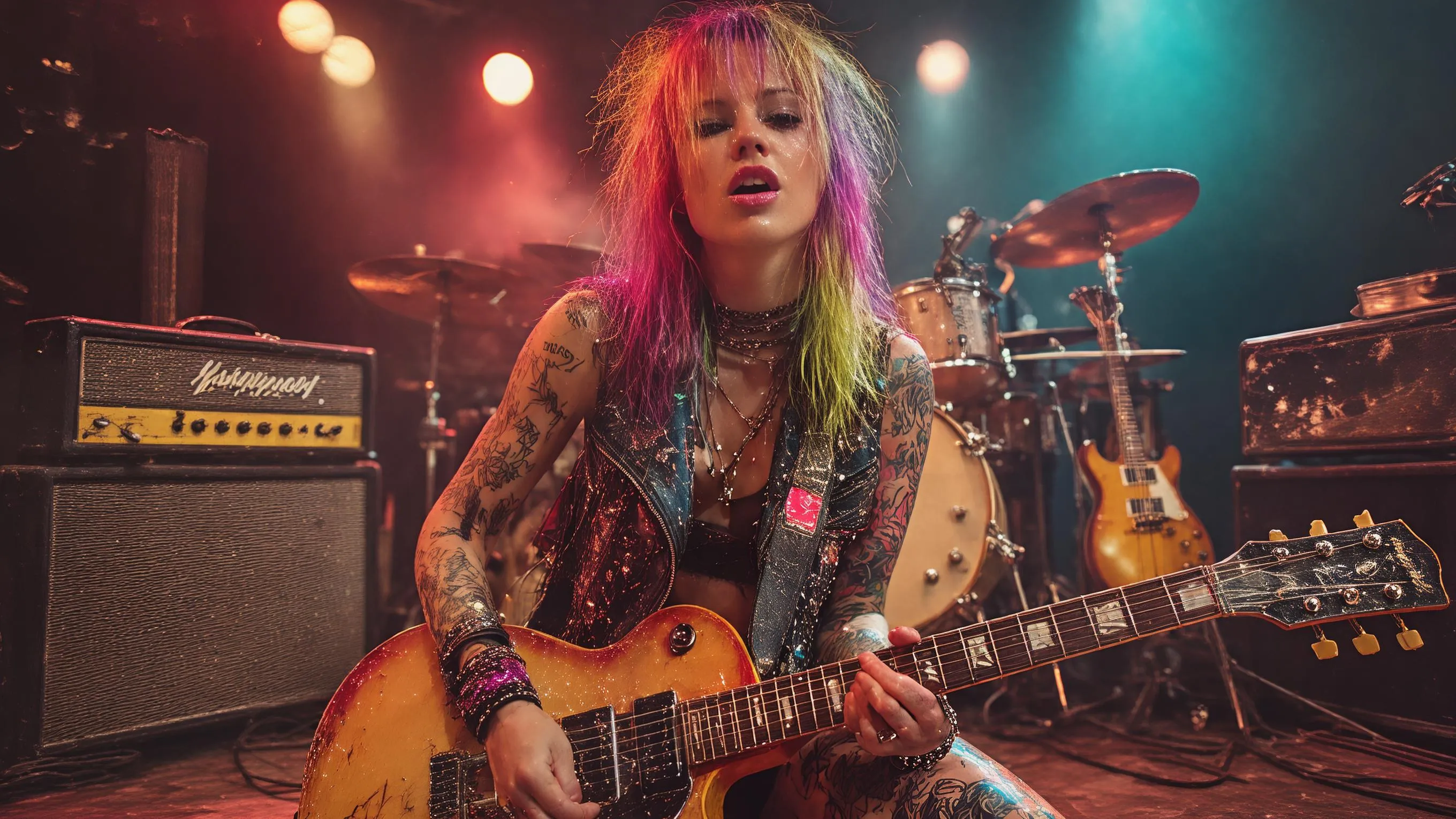 A beautiful, sexy, sweaty hot female punk rock guitarist, adorned with colorful spikes and vibrant tattoos, sits in front of an eclectic guitar setup with multiple guitars and amplifiers. Nostalgic Polaroid-style widescreen shot with faded, grainy texture, vivid washed-out colors, dynamic motion blur capturing her intense, energetic performance, embodying the rebellious spirit of the 80s, stage lights illuminating her passion.