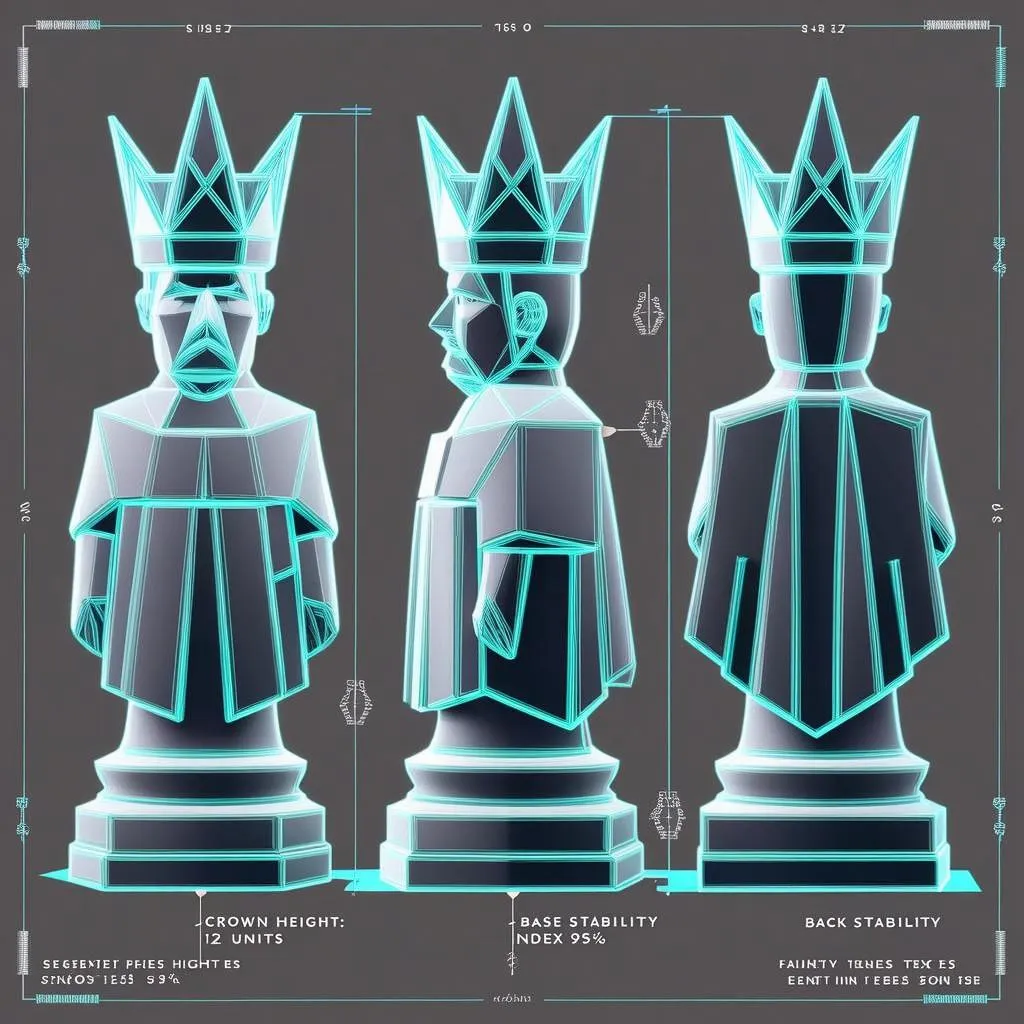 Generate a regal low-poly chess king 3D model with blueprint-inspired orthographic views. Features cyan wireframe overlays, geometric crown spikes, weathered marble textures, and 3D-printing-optimized hollow structure. Includes technical annotations, coordinate grids, and cross-section diagrams for precision modeling. Ideal for game assets, 3D printing, or architectural visualization projects requiring angular, polygonal royal chesspiece designs.