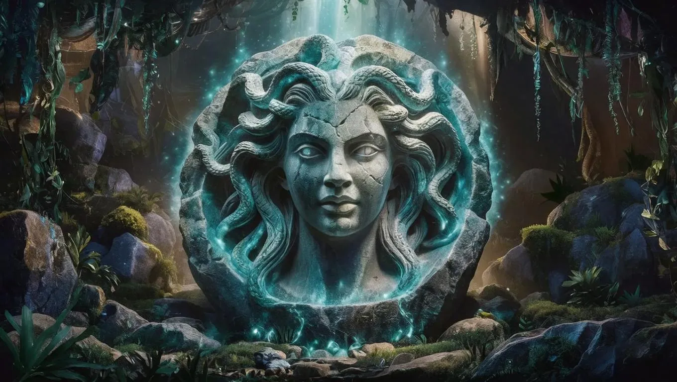 Discover AI-generated ancient Goddess Medusa art with cyan hues, intricate rock designs, and weathered textures. Create surreal, dreamlike visuals of forgotten civilizations using advanced text-to-image AI tools. Transform prompts into professional-grade visuals with overgrown landscapes and mystical storytelling elements.