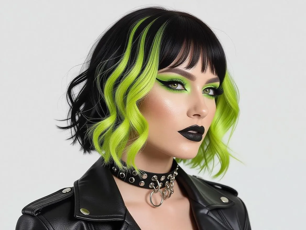 Transform your text into striking visuals with Vivago.ai’s AI image generator. Create a side profile of a cyber-goth woman featuring vibrant lime green and black wavy bob hair, bold black lipstick, and sleek black leather attire. Experience effortless AI art generation for stunning results.