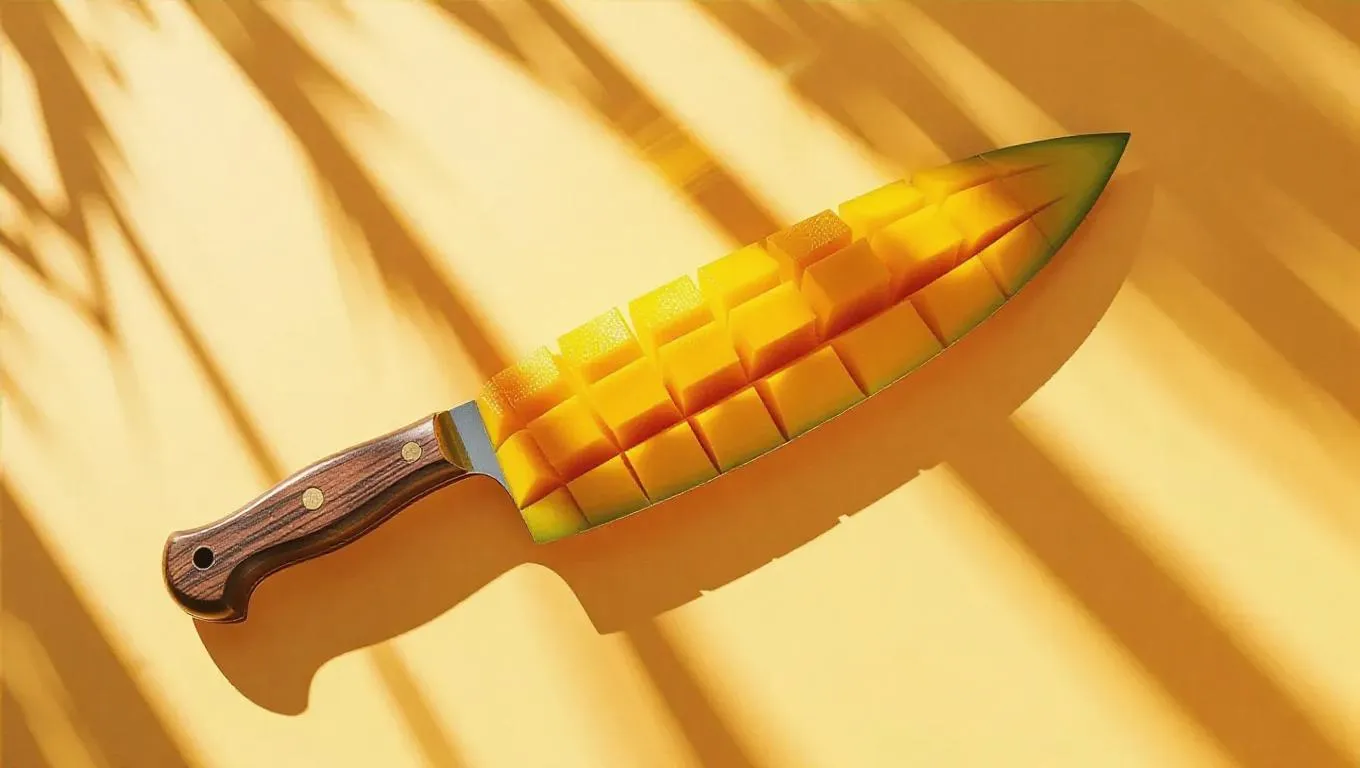 A unique machete crafted from vibrant mango slices, illuminated by a warm golden light, set against a simple, soft shadow background, creating a surreal and artistic composition.
