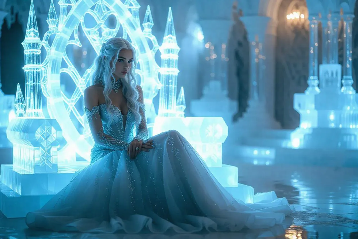 Elegant ice queen, seated majestically on an intricate ice throne within her luminous ice castle. Her flowing silver hair and shimmering icy gown exude a sensual, ethereal beauty. The castle’s crystalline walls reflect the soft, blue glow of enchanted lights, creating a mesmerizing atmosphere.