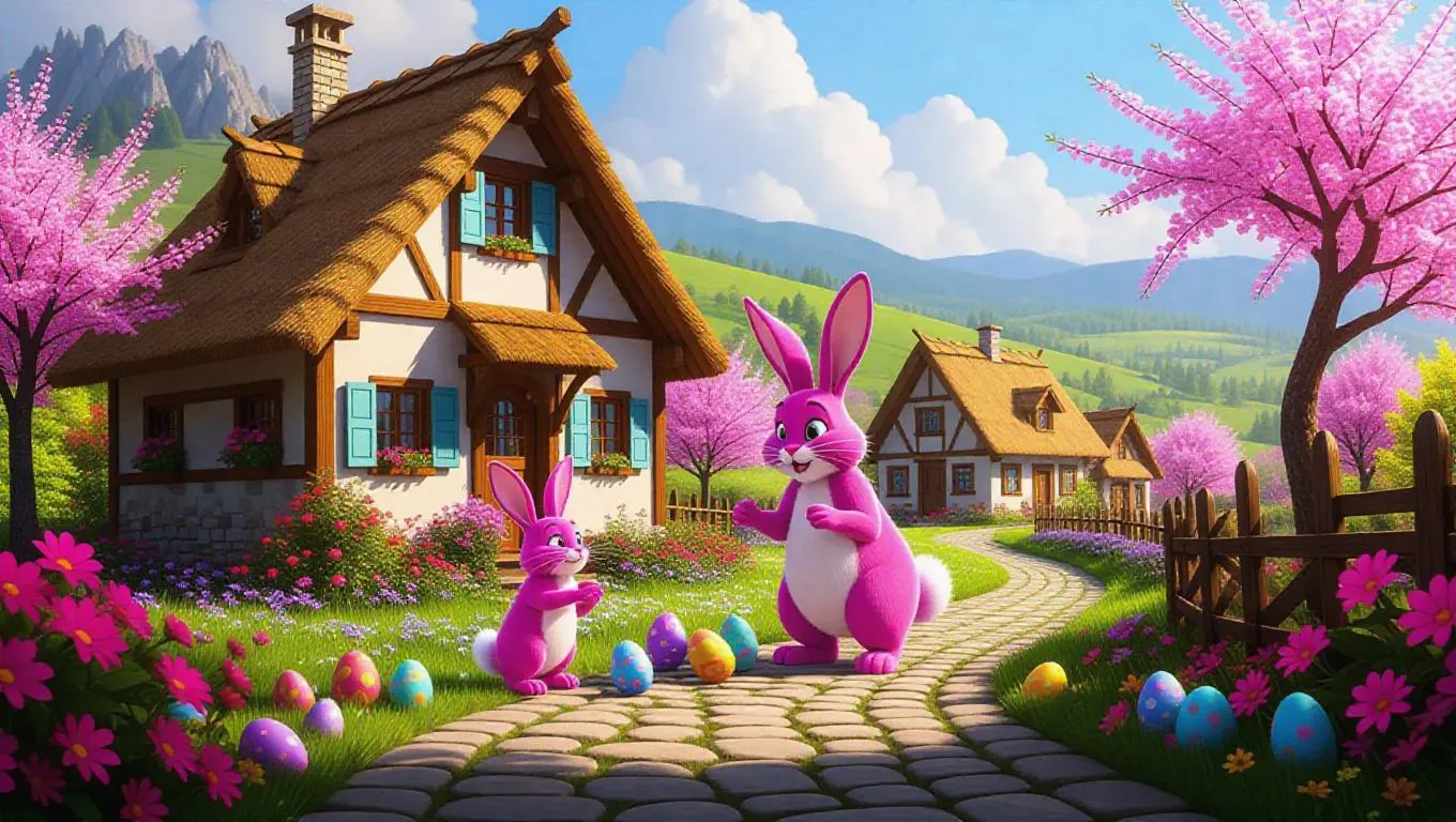 Create a whimsical Easter scene with AI-generated art: Pink Panther and Easter Bunny painting eggs beside a rustic Hungarian village house. Explore vivago.ai's AI image tools for vibrant holiday visuals, text-to-image magic, and professional editing effects. Perfect for festive creativity and unique AI-powered artwork.