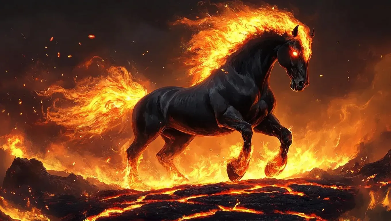Generate a fiery fantasy AI image of a majestic horse with flaming mane, glowing eyes, and molten lava backdrop. High-detail dark fantasy creature art in epic digital painting style, dramatic lighting, smoke, and sparks. Perfect for AI-powered creative tools transforming text into vivid, professional-grade visual storytelling.