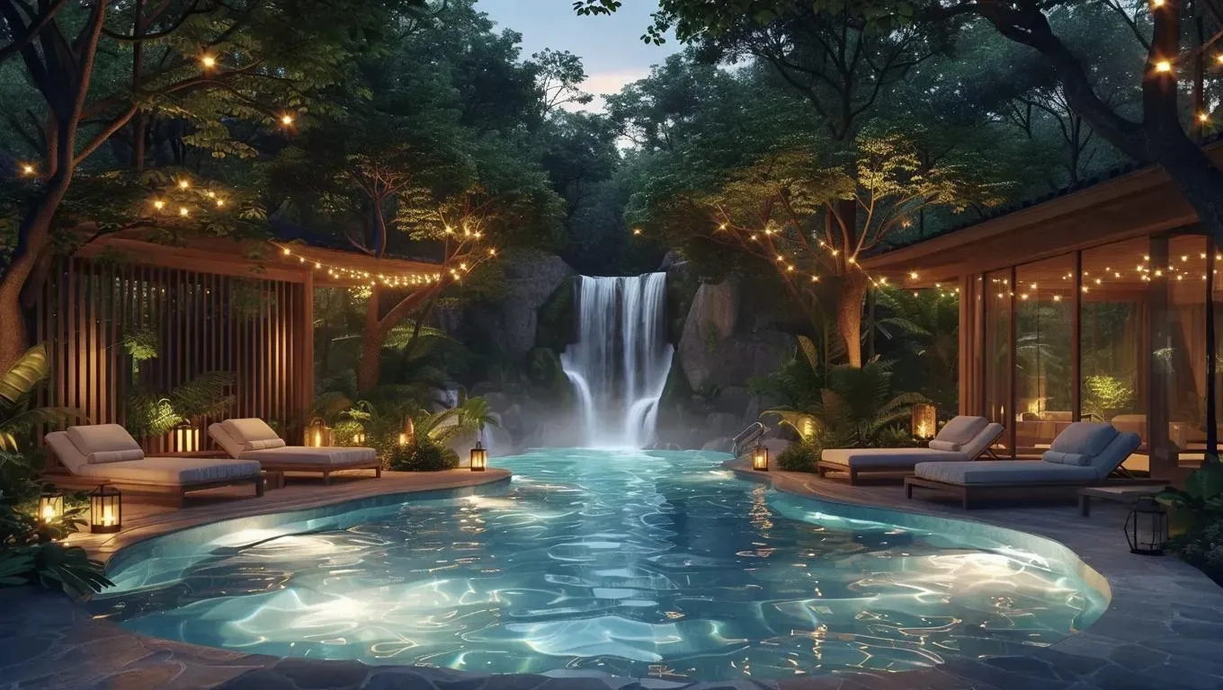 Generate a serene spa scene with AI-powered soft ambient lighting, lush natural surroundings, and tranquil aesthetics. Create calming visuals that capture peaceful relaxation in a harmonious, comfortable environment—perfect blend of comfort and tranquility for immersive AI-generated spa ambiance and nature-inspired relaxation imagery.