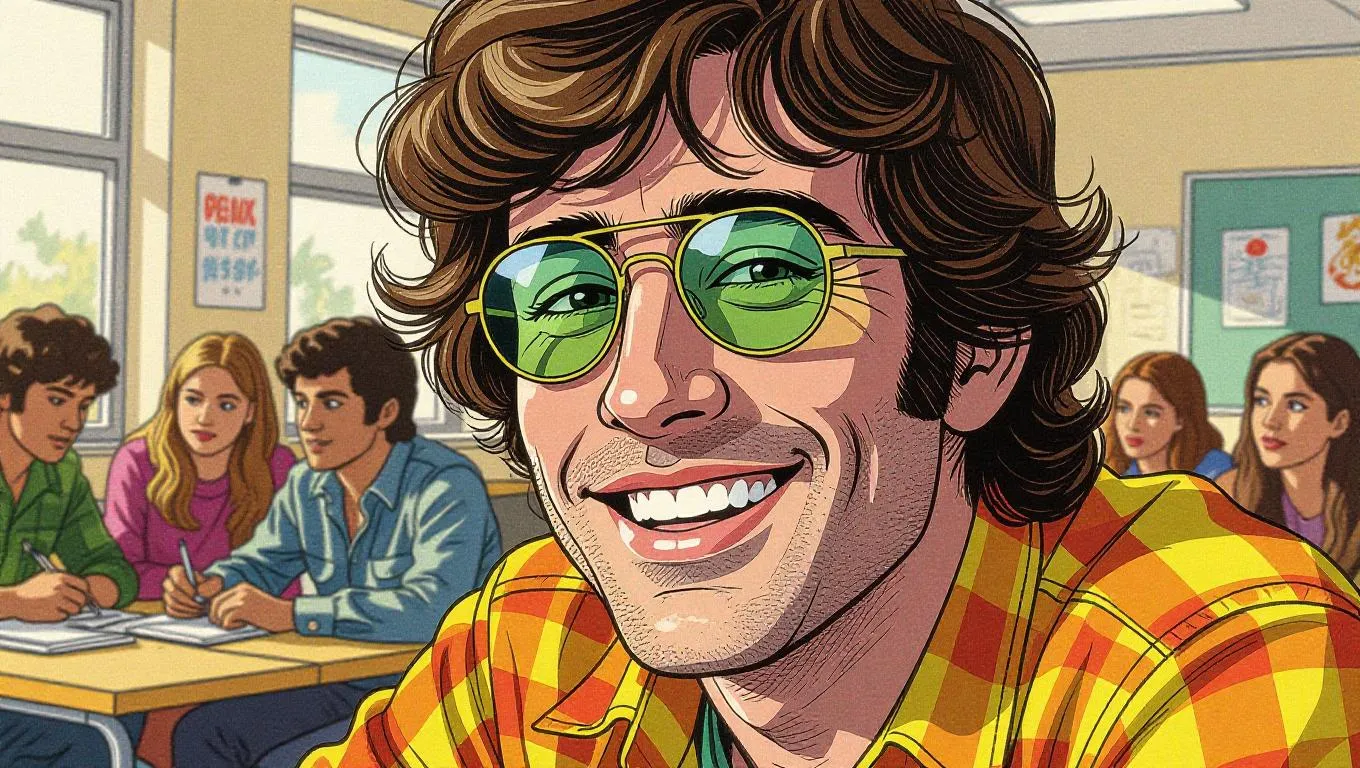 Generate a retro 70s university hall scene featuring smiling close-up students in comic style. Hippie-inspired draft with Kodachrome film tones. Crafted as a colored ballpoint pen drawing using precise cross-hatching, pastel fluo pencils, and tangy Enki Bilal aesthetics for vivid AI art creation.