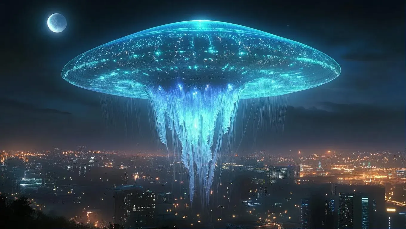 Generate mesmerizing sci-fi digital art of a bioluminescent alien mothership hovering above a modern metropolis. AI transforms text into surreal visuals: translucent jellyfish-like UFO with glowing patterns, eerie night cityscapes, and atmospheric mystery. Create unsettling yet awe-inspiring extraterrestrial scenes effortlessly with VivaGo's advanced AI art tools for professional-grade sci-fi imagery.