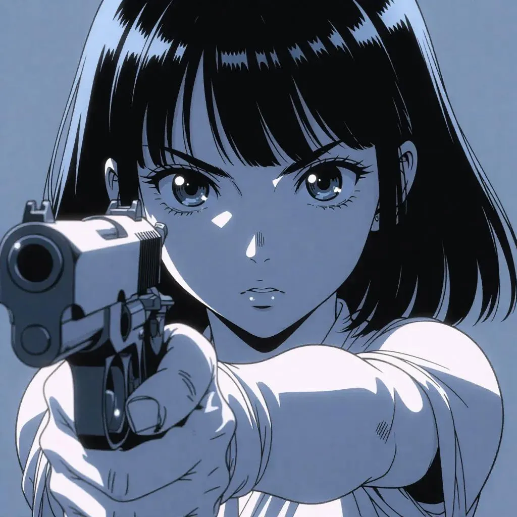 Create 90s anime-style art with vivago.ai. Generate a 16-year-old girl featuring big shining eyes, gray tones, and Zibli-animated effects. Perfect for retro anime fans seeking monochromatic, dynamic character designs with a gun. AI-powered tools bring your 90s Japan animation visions to life effortlessly.