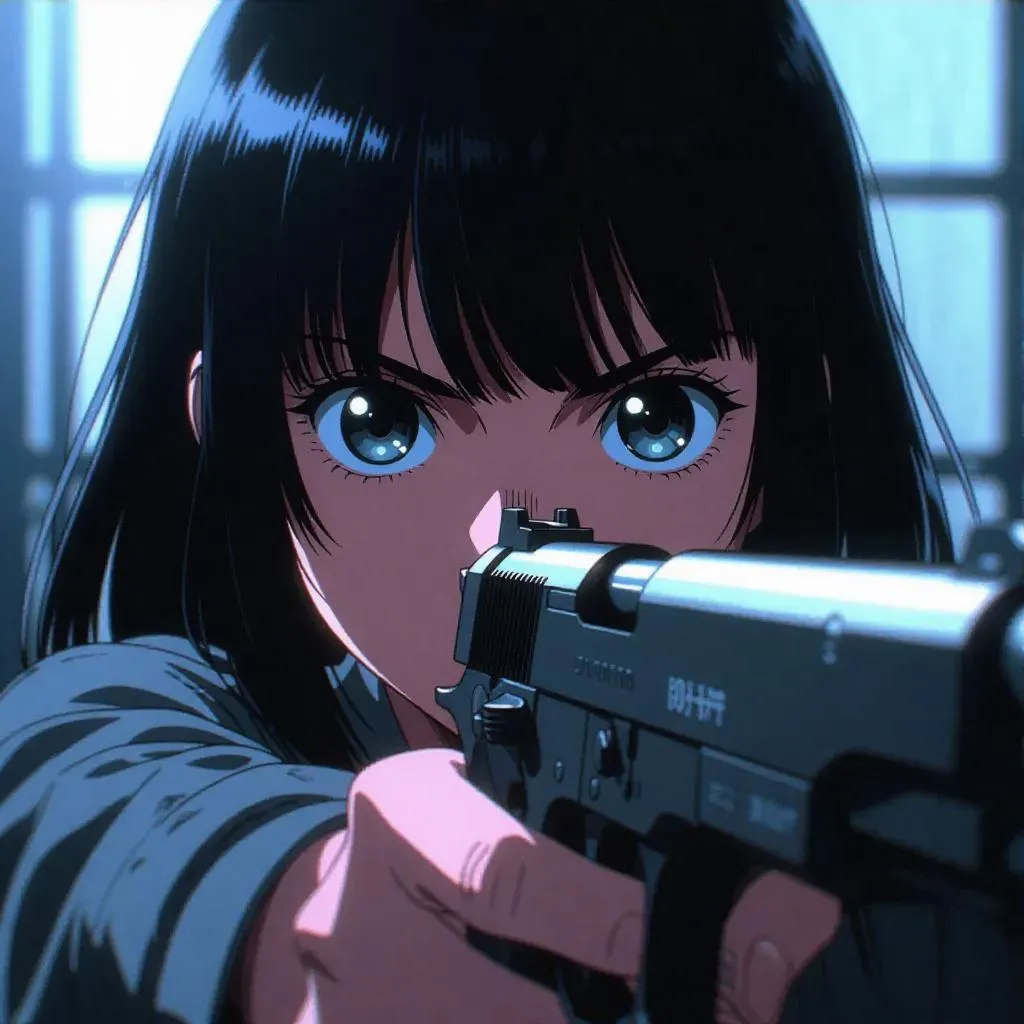 Create 90s anime-style art with vivago.ai. Generate a 16-year-old girl featuring big shining eyes, gray tones, and Zibli-animated effects. Perfect for retro anime fans seeking monochromatic, dynamic character designs with a gun. AI-powered tools bring your 90s Japan animation visions to life effortlessly.