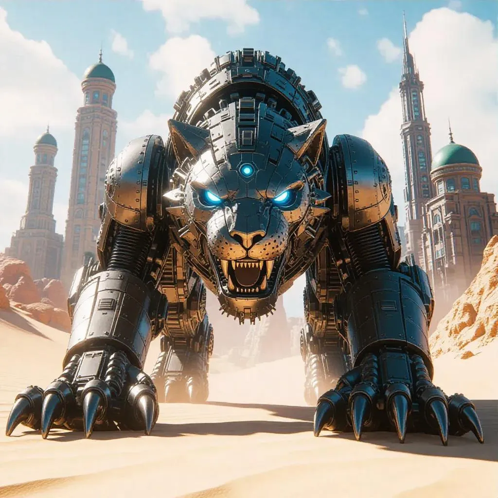 A colossal steampunk lion crafted from intricate gears, armored plates, and glowing blue eyes roars in a desert, poised to strike. Behind it, a futuristic cityscape merges oriental-inspired domes with advanced tech under a clear sky. Generate cinematic, AI-powered cyberpunk visuals with vivago.ai's cutting-edge image creation tools for professional-grade artistry.