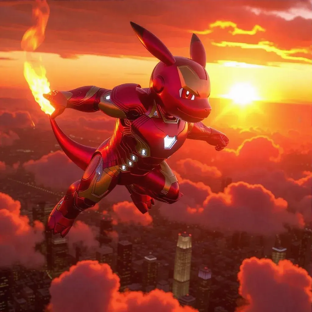 Charmander donning an intricate Ironman suit, soaring through a vibrant sky, flames from its tail blending with the sunset hues, casting a heroic silhouette against the horizon, with cityscapes and clouds below adding depth and scale.
