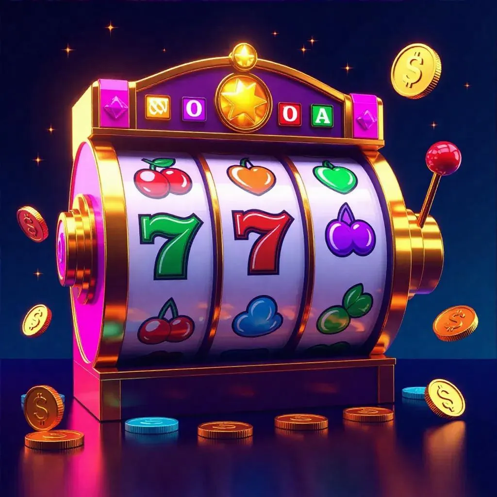 Create a vibrant, HD cartoon-style slot machine with playful bounce animations. Features bold metallic edges, candy-colored reels (7s, cherries, diamonds), glowing LED accents, and smooth spins. Set against a sunny yellow-to-blue gradient backdrop with floating gold coins, sparkling stars, and exaggerated shine for a dynamic, polished game icon. Perfect for eye-catching visuals in modern gaming or app designs.