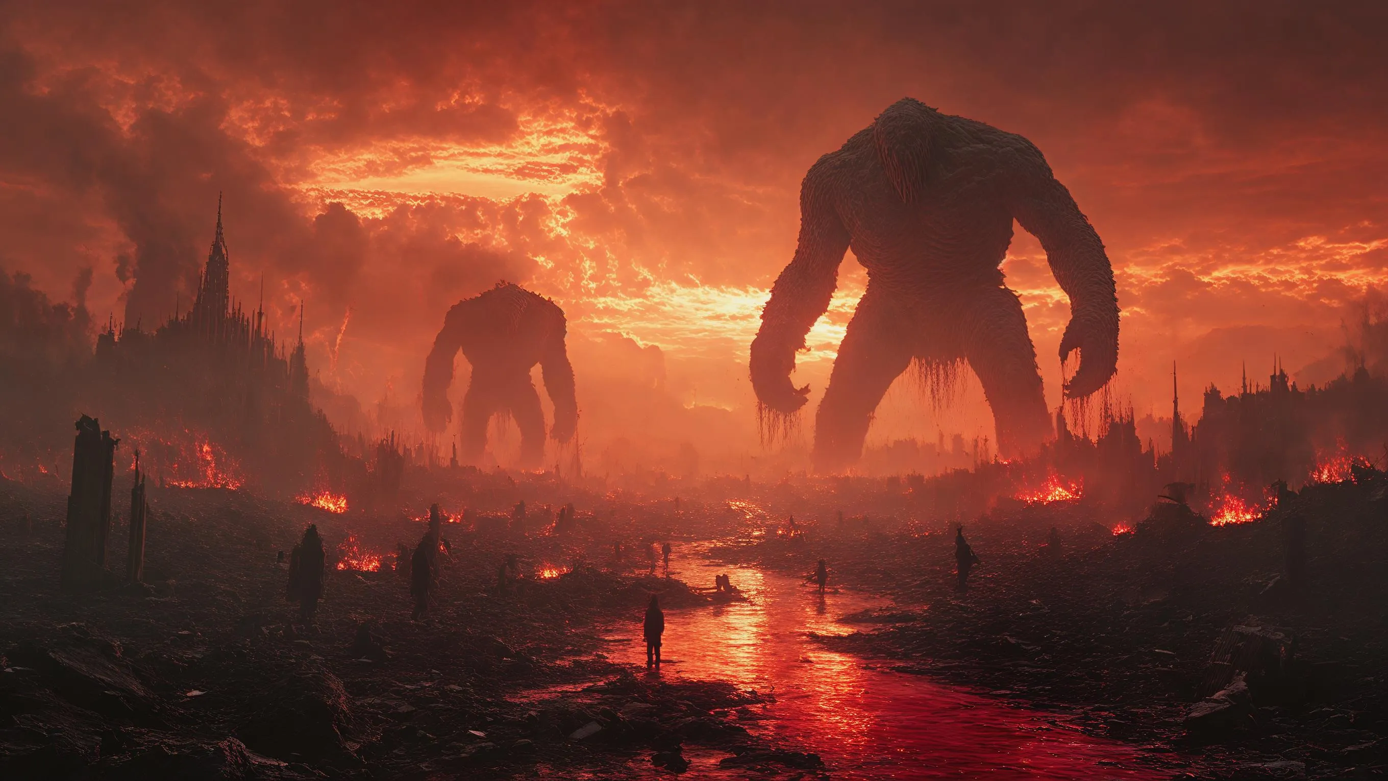 Generate apocalyptic AI art with vivago.ai. Create cinematic scenes of giants ruling a devastated world: burning landscapes, crushed cities, rivers of blood and ash. Dark mythological style, 16:9 scale. Transform text prompts into professional-grade visuals using AI image effects and editing tools.