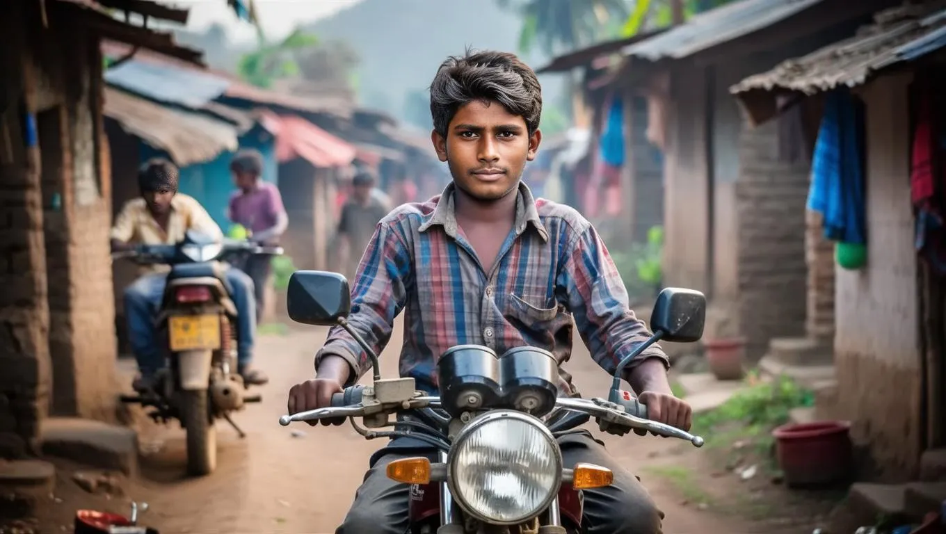Explore AI-generated images of a passionate village motorcycle enthusiast. Capture rural life's essence with dynamic visuals blending tradition and modern adventure—ideal for motorcycle lifestyle content, creative storytelling, and showcasing youthful energy in rustic settings through AI-powered image generation tools.