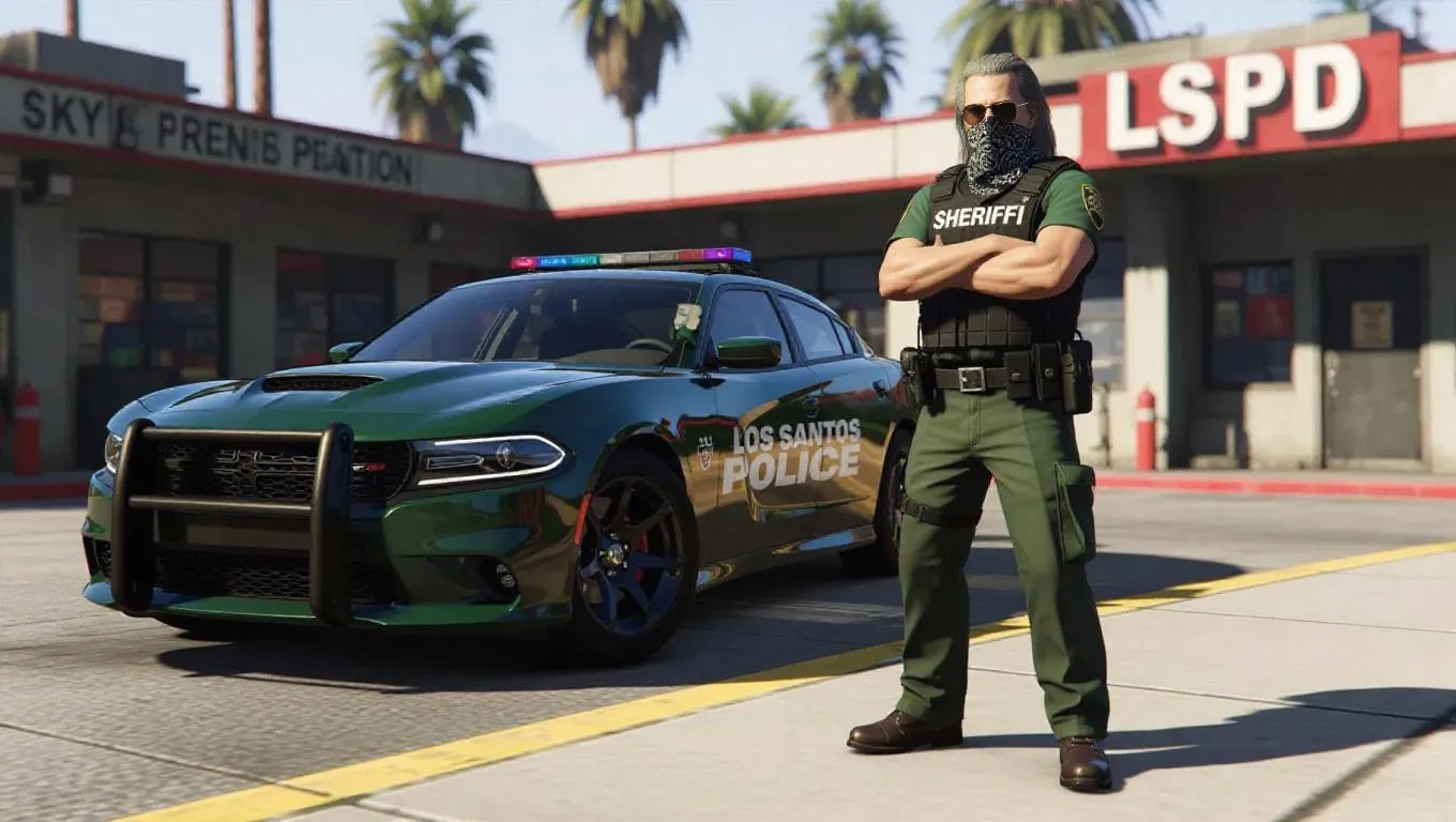 A man in his 50s with medium long slickback gray hair, aviator glasses, a bandana covering his nose and mouth, police officer, bulletproof vest with "SHERIFF" on chest, green shirt underneath, dark green pants, leather boots. His arms crossed, standing next to a 2024 green Dodge Charger police pack with "LOS SANTOS POLICE DEPARTMENT" stickers. Police station with LSPD sign. Los Angeles style. Afternoon. Sunny. Concrete. HD.