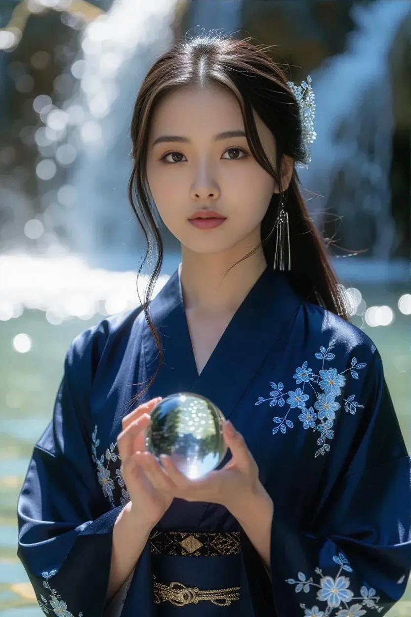 Vivago.ai transforms text into stunning Art Nouveau visuals. Experience a serene Asian-inspired fantasy scene: a young woman with obsidian eyes and silver-adorned hair stands by a crystalline waterfall, surrounded by bioluminescent flora. Hyperrealistic textures capture flowing silk, glowing crystal orbs, and ethereal turquoise cascades. AI-powered magical realism evokes wonder in this dreamlike, wide-angle landscape with soft, diffused lighting.