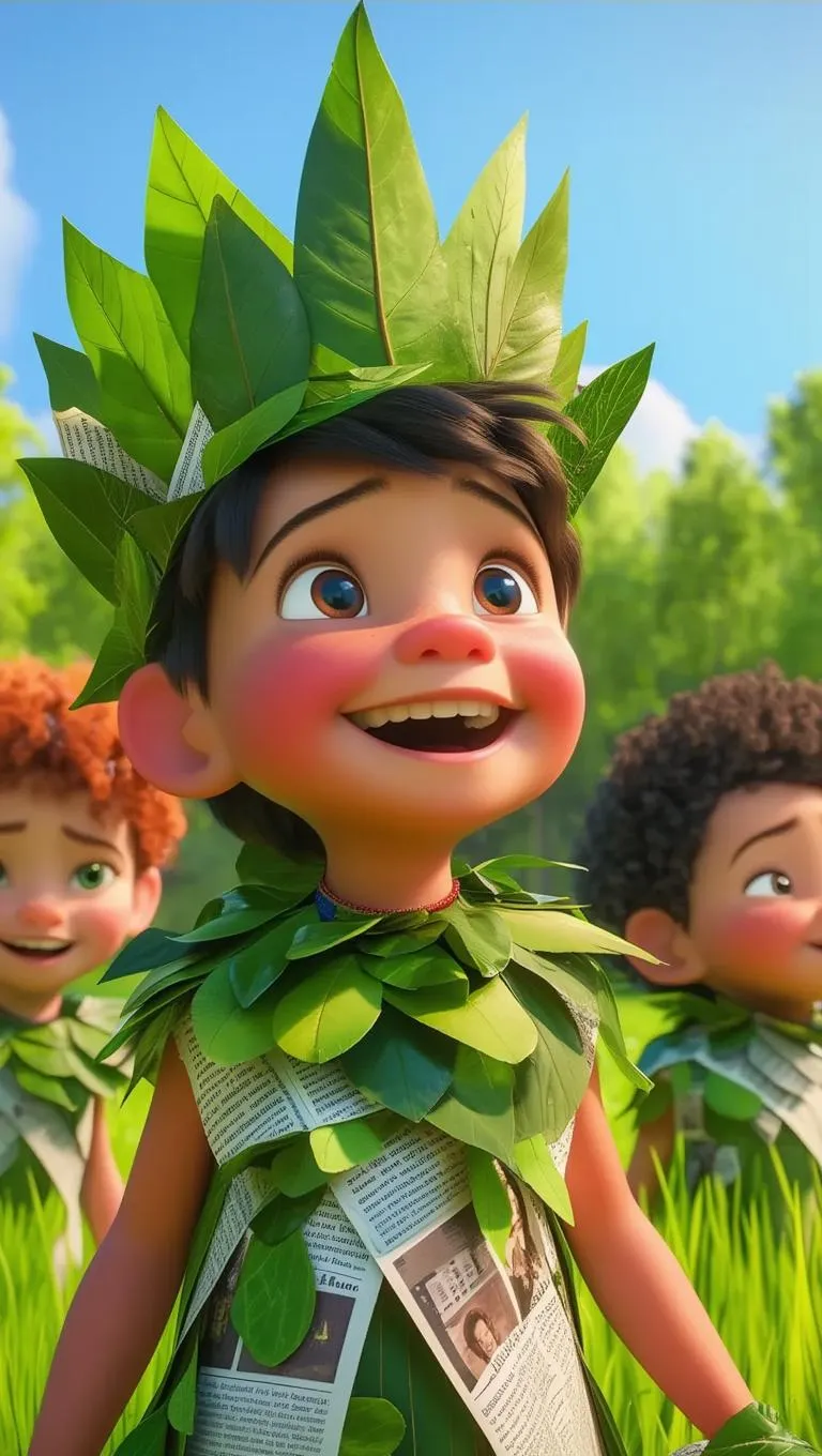 Create AI-generated Pixar-style art of joyful 4-year-olds in royal leaf and newspaper outfits, playing on a sunny green field. Transform text to vibrant visuals with VivaGo.ai's tools for whimsical, eco-friendly character designs and vivid animation. Perfect for crafting playful, professional-grade children's storytelling visuals. #Pixar #AIArt #CreativeAI