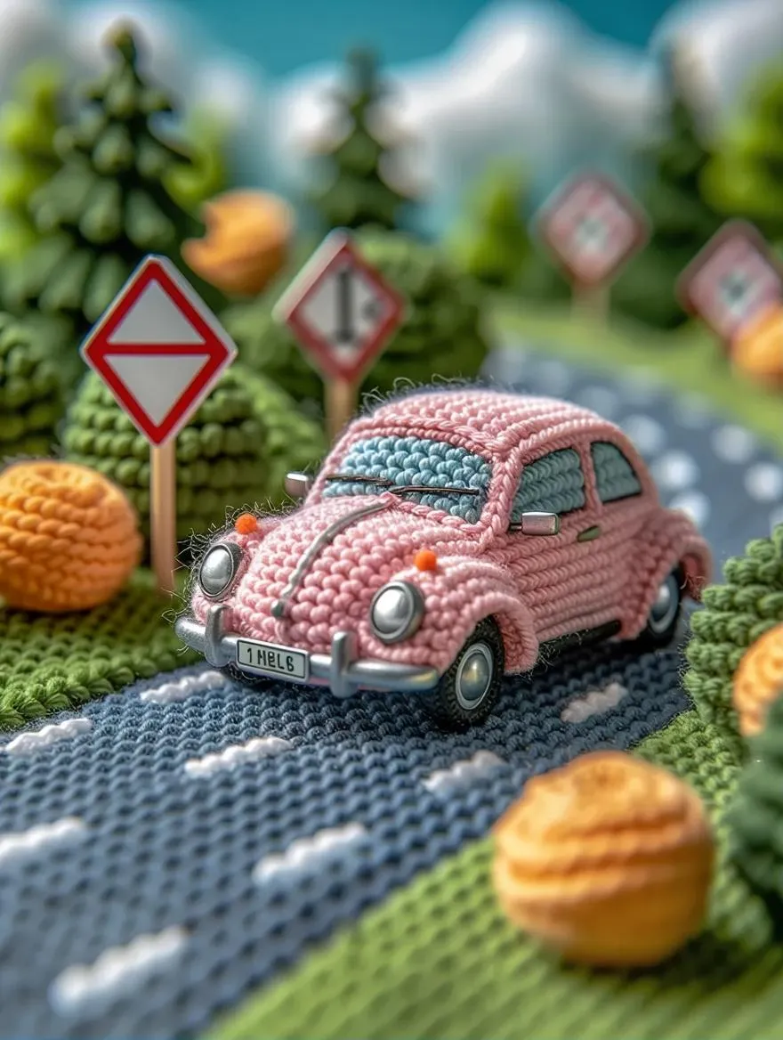 Create photorealistic still life images featuring a crocheted retro car on a yarn-textured road, surrounded by knitted signs and tiny bushes. Vivago.ai transforms prompts into detailed textile art scenes with vivid handcrafted textures using advanced AI image generation for professional results.