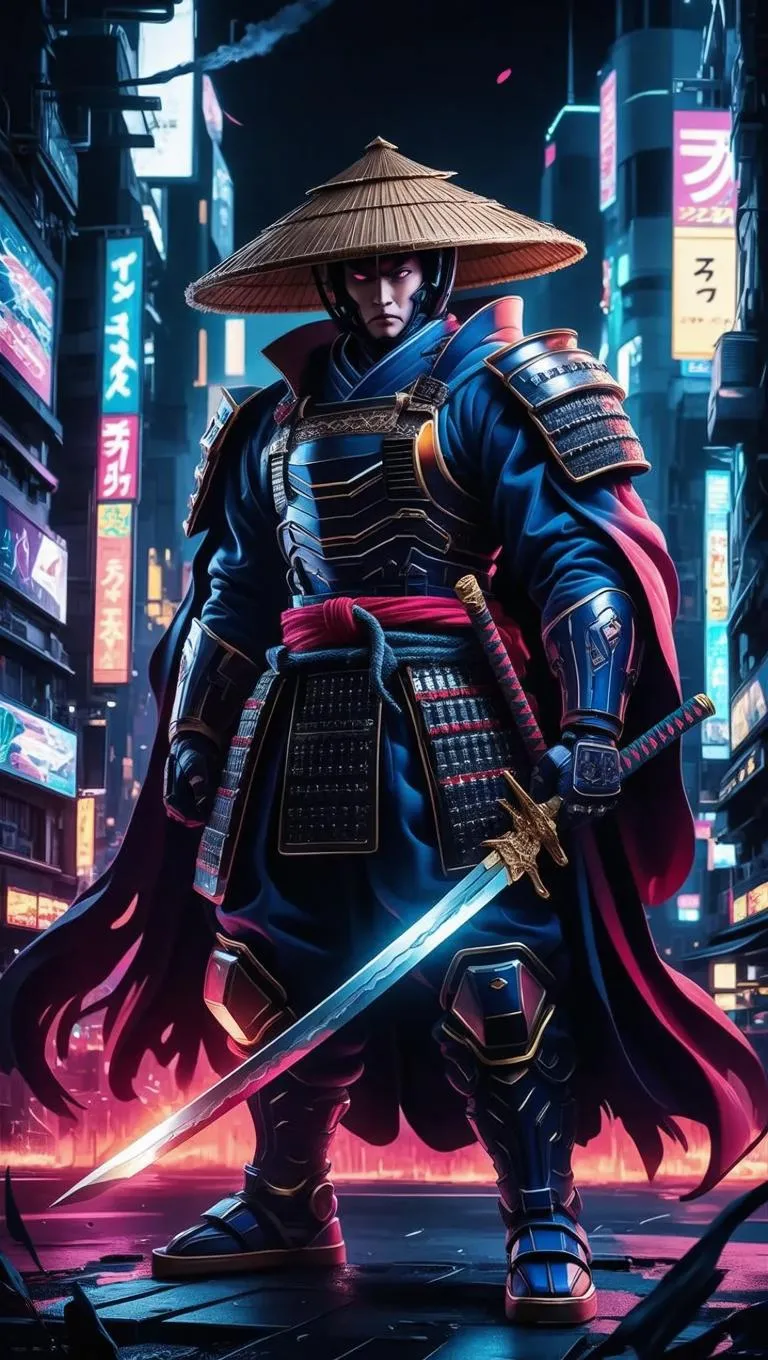 Generate a cyberpunk anime warrior wielding razor-sharp katanas in neon-lit metropolises, featuring intricate armor, holographic ads, and dramatic anime lighting. Inspired by Akira and Ghost in the Shell, this AI-generated image combines dynamic posing, metallic accents, and vivid neon contrasts for bold cybernetic storytelling. Create Blade Runner-style visuals with razor-edged weapons and industrial futurism using advanced AI tools.