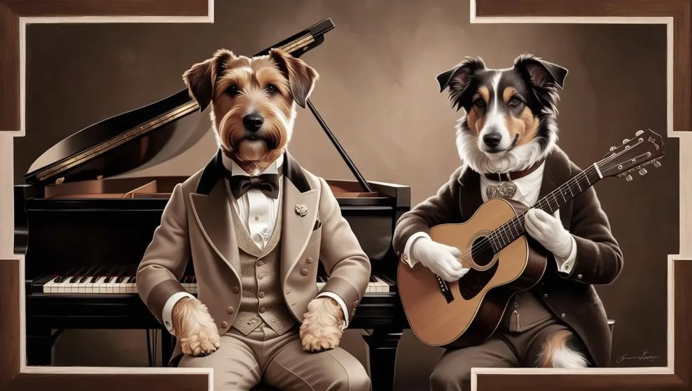 Create timeless AI art with this sepia-toned scene: a Victorian-dressed Wheaton Terrier elegantly plays a grand piano beside a Border Collie strumming a vintage guitar. Enhanced by rich brown-and-white borders, this AI-generated image blends 19th-century charm, canine musicians, and nostalgic ambiance—perfect for vintage aesthetic projects using Vivago.ai's AI effects and image generation tools.