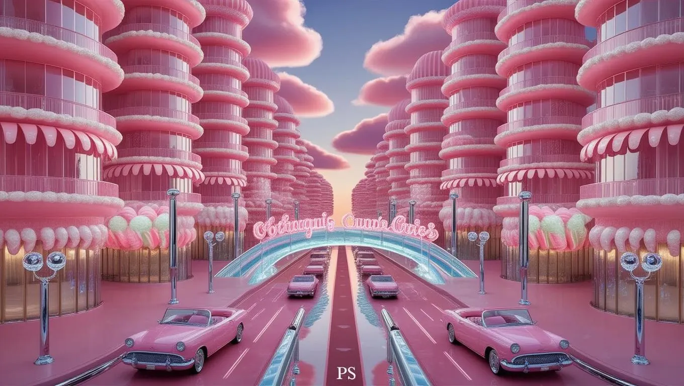Generate a whimsical AI-generated metropolis of candy-coated architecture: rose-quartz skyscrapers, bubblegum-pink roads, and neon-lit glass bridges. Vivago.ai transforms text prompts into vivid AI art, crafting surreal cityscapes with chrome lollipop streetlights, crystalline gumdrop ornaments, and cotton-candy clouds under dawn's peachy glow. Ideal for dreamlike digital art or imaginative branding visuals.