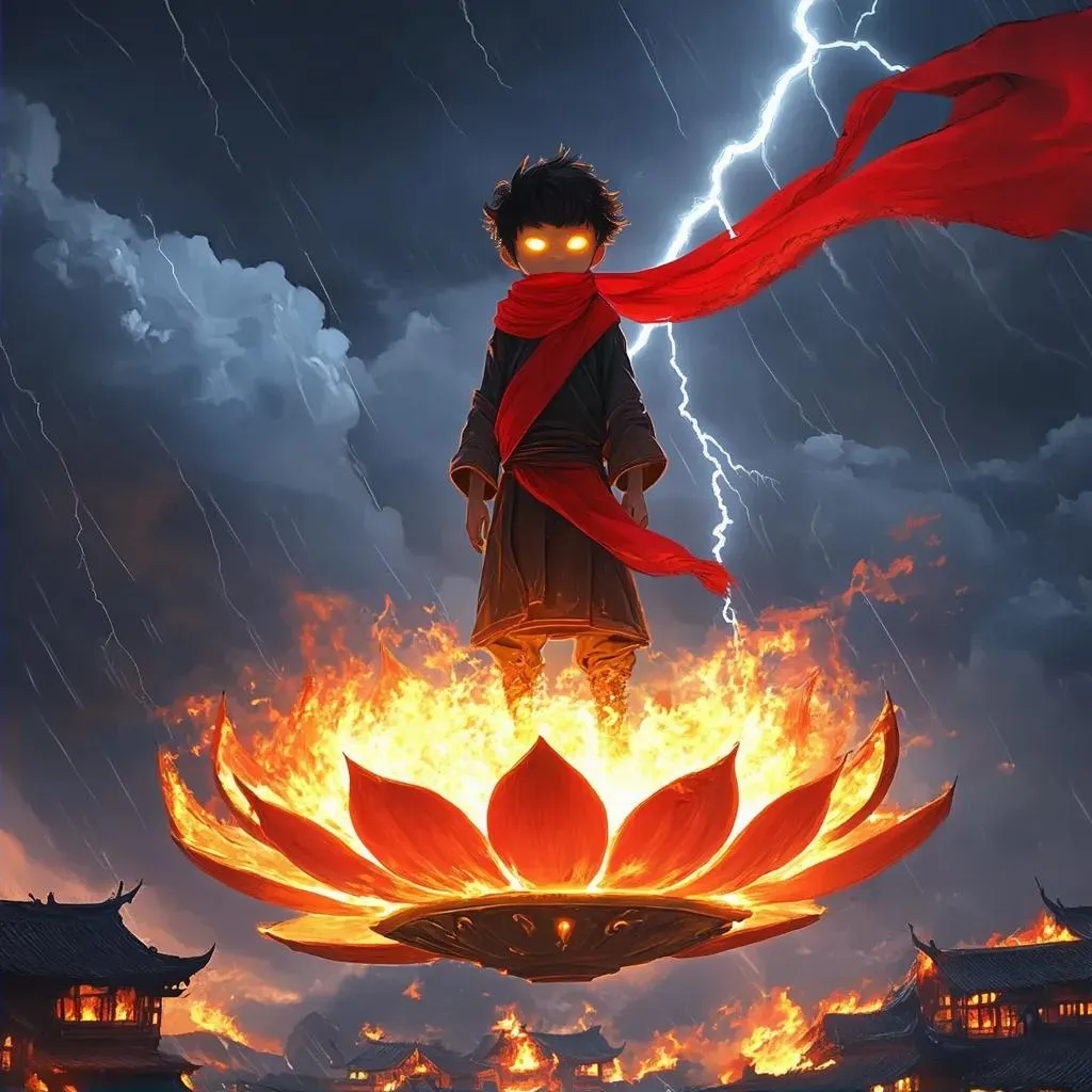 Dramatic Chinese-style AI art depicts a boy with a red scarf and glowing golden eyes atop a lotus firewheel. Lightning splits a stormy sky as he descends toward a burning village, evoking Nezha's mythic power and cinematic intensity. Generate mythic scenes with classical motifs using Vivago.ai's AI effects.