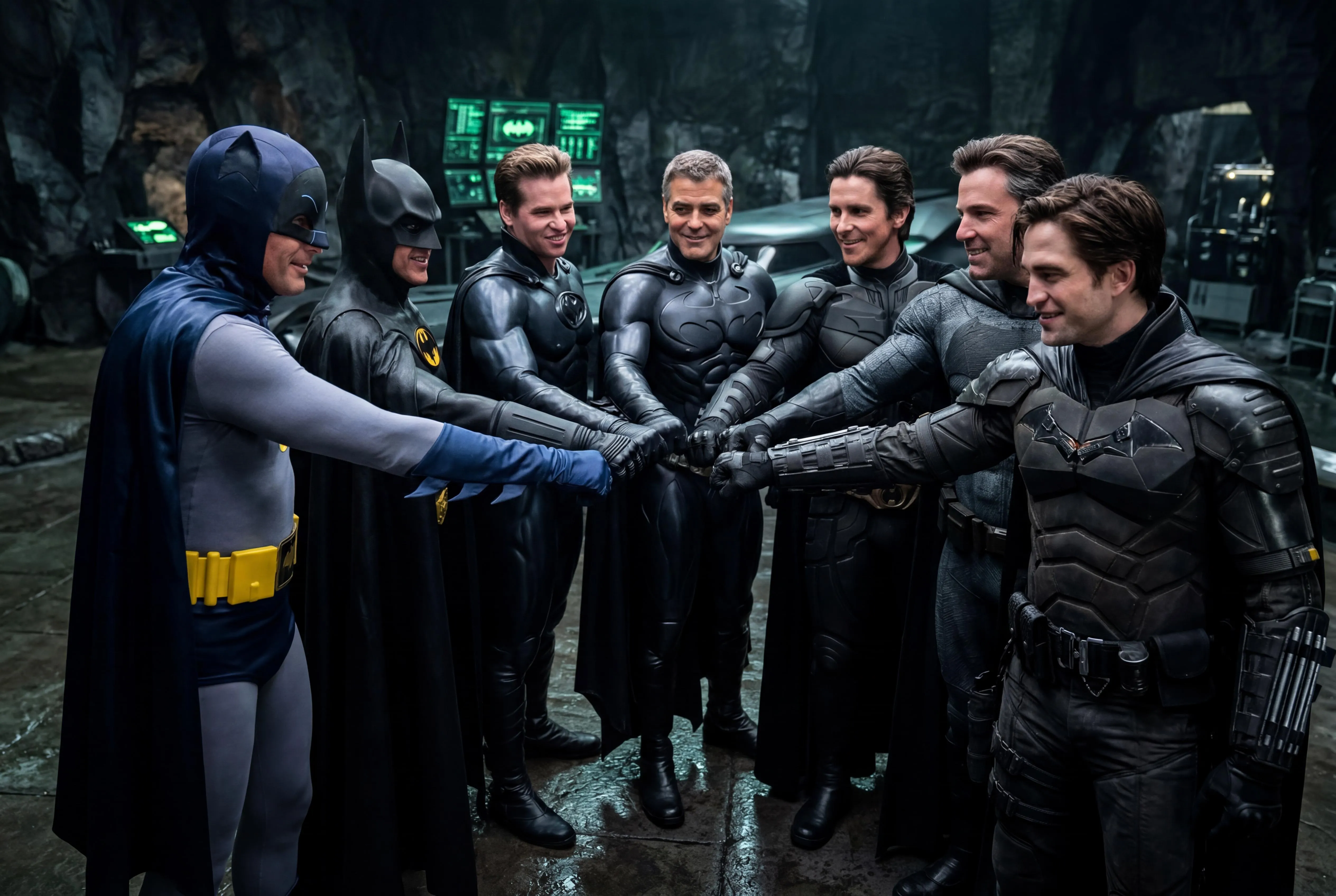 Batman (portrayed by Adam West, Michael Keaton, Val Kilmer, George Clooney, Christian Bale, Ben Affleck, and Robert Pattinson) share a knuckle bump together.