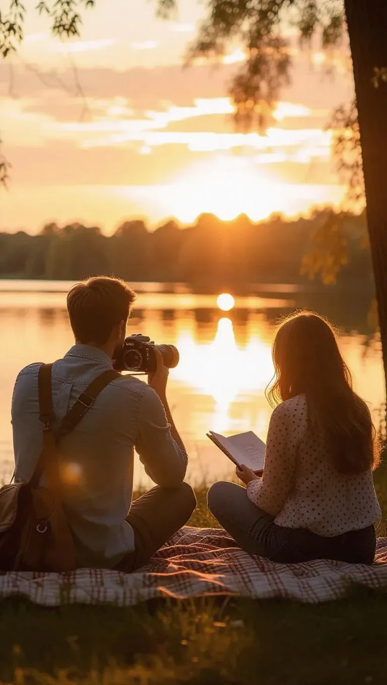 A golden-hour lakeside scene, warm hues casting a romantic glow. Elias with a vintage camera slung over his shoulder, shirt sleeves rolled up, capturing moments. Liora sitting cross-legged on a blanket, sketchbook open, sunlight highlighting her auburn hair, both immersed in their own worlds yet connected by the serene atmosphere.