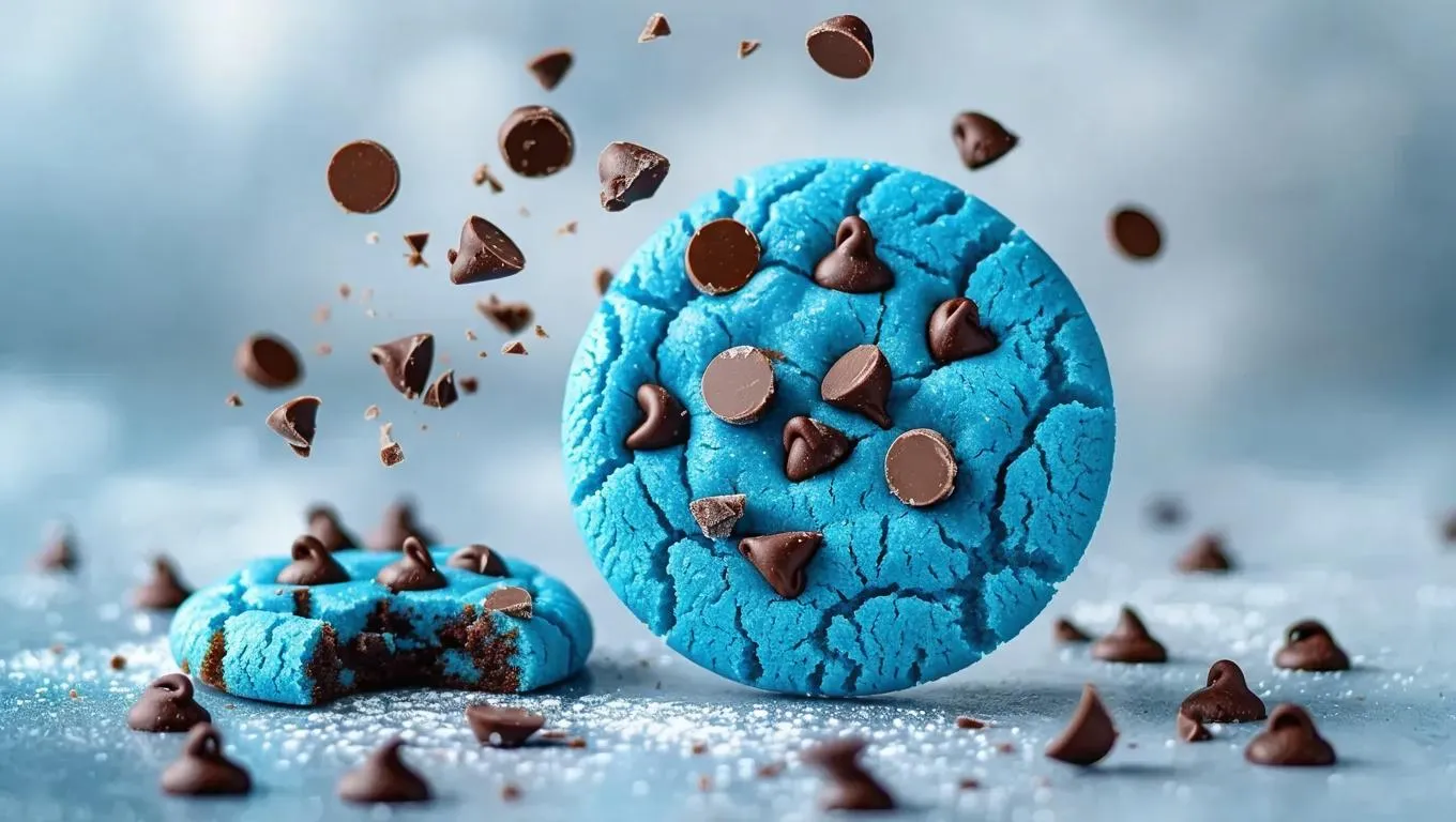 Generate a vivid AI blue front-facing cookie with chocolate chips and dynamic flying crumbs on a crisp white background. Elevate your designs with vivago.ai's AI effects for striking, professional-quality visuals. Perfect for branding, ads, or creative projects.