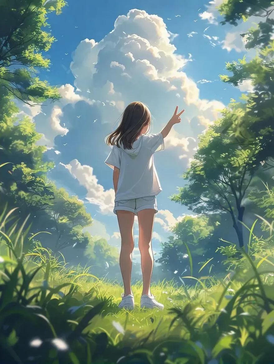 Create ultra-realistic AI images of a slender teenage girl in a serene grassy setting, wearing casual shorts and white sneakers. Perfect for detailed, lifelike visuals with a peaceful cloudy sky backdrop and natural poses like a peace sign. Ideal for professional AI-generated content blending realism and tranquil outdoor aesthetics.