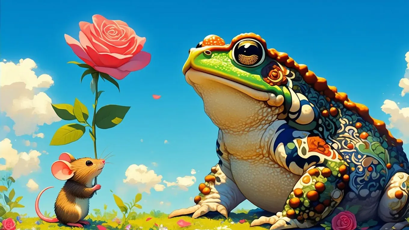 Generate a whimsical AI image of a big toad offering a rose to a mouse under a vibrant blue sky. Vivago.ai transforms text prompts into magical storytelling visuals with creative effects, fantasy art styles, and lifelike details. Explore AI-generated nature scenes, anthropomorphic characters, and enchanting animal interactions for unique digital art or social media content.