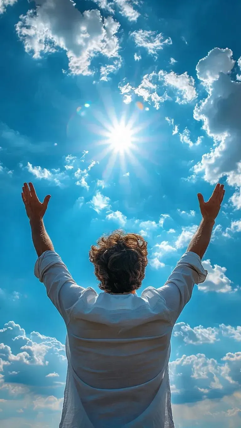 4K realistic AI-generated image of a man raising his hands skyward in gratitude, crafted with advanced AI tools for vivid details and lifelike textures. Perfect for spiritual, motivational, or nature-themed projects. Elevate your content with hyper-realistic AI visuals.