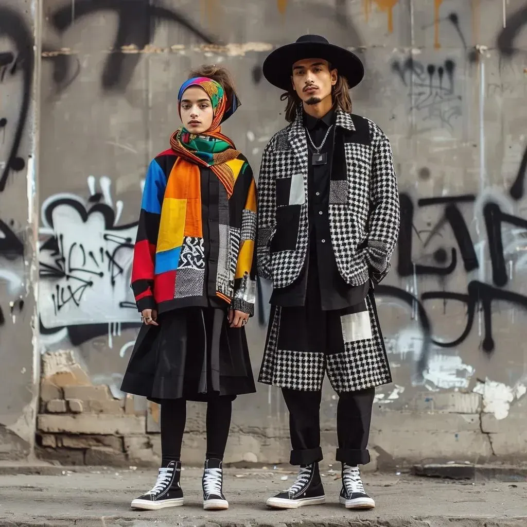 Transform text prompts into vivid AI-generated visuals with vivago.ai. Create a striking contrast between a tall, slim man in black hat, patchwork cap, and monochrome attire alongside a shorter girl in a headscarf. Leverage AI tools for fashion-forward details, dynamic character pairings, and professional-grade creative projects.