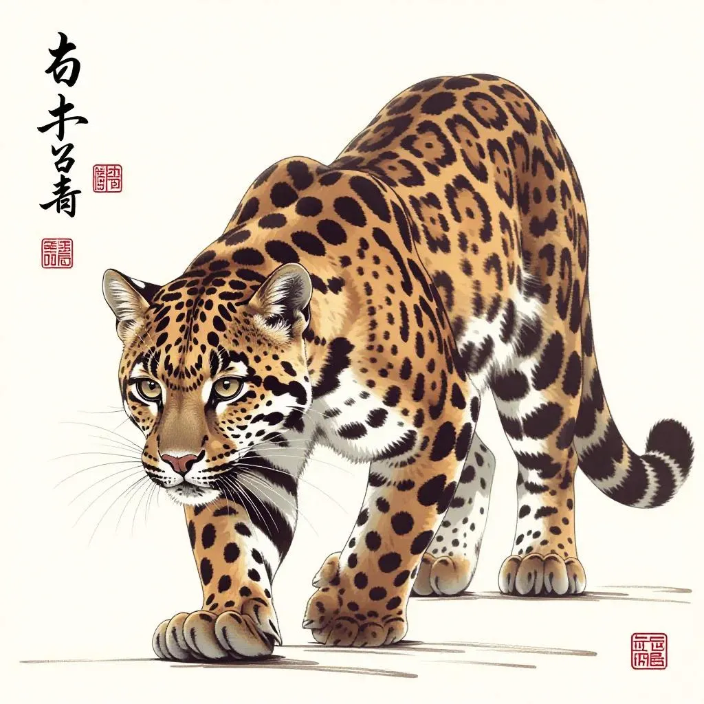 Sumi-e detailed art style, Bornean clouded leopard with black and brown colors, intricate brushstrokes capturing the leopard's graceful movements, set against a minimalist background, evoking a sense of serene wilderness.