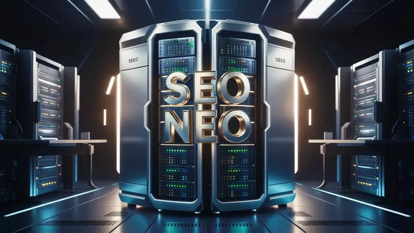 SEO NEO: AI-powered search engine optimization device with a server rack-inspired design, vibrant front lights, and whimsical 3D font branding. Compact copy machine-sized tech merges cutting-edge SEO tools and playful aesthetics to elevate website visibility, rankings, and digital performance effortlessly. Perfect for pros seeking innovative, space-efficient solutions.