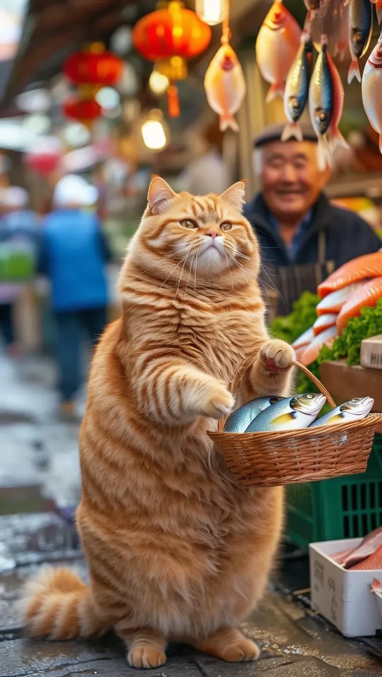 Generate an AI image of a chubby orange tabby cat standing on hind legs in a bustling outdoor market, holding a basket while selecting fresh fish. Vibrant scene features colorful produce, hanging lanterns, and a smiling fishmonger. Perfect text-to-image AI prompt for lively market atmospheres with adorable, whimsical charm and professional editing tools.